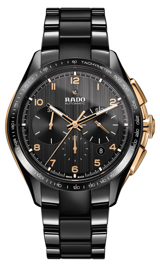 Luxusní hodinky Rado Hyperchrome Keramika, Automat, Chronograf, 45 mm. Hodinky disponují funkcemi luminiscencia, stopky, tachymeter a ukazovateľ dátumu. Základní parametry hodinek jsou: barva číselníku je černá, typ strojku je mechanický chronograf s automatickým nátahem, materiál řemínku je keramika a vodotěsnost je 100 m.