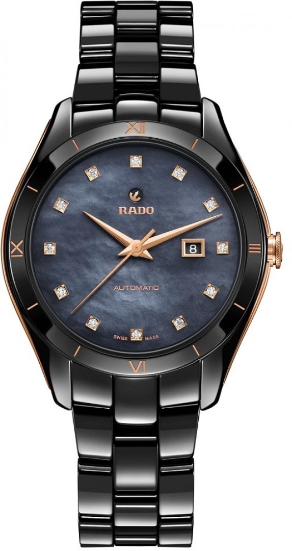 luxusní hodinky Rado Hyperchrome Diamanty, Automat, 36 mm. Hodinky disponují funkcemi ukazatel data. Základní parametry hodinek jsou: typ strojku je mechanické hodinky s automatickým nátahem, vodotěsnost je 100 m, materiál řemínku je titan a keramika a barva číselníku je modrá.