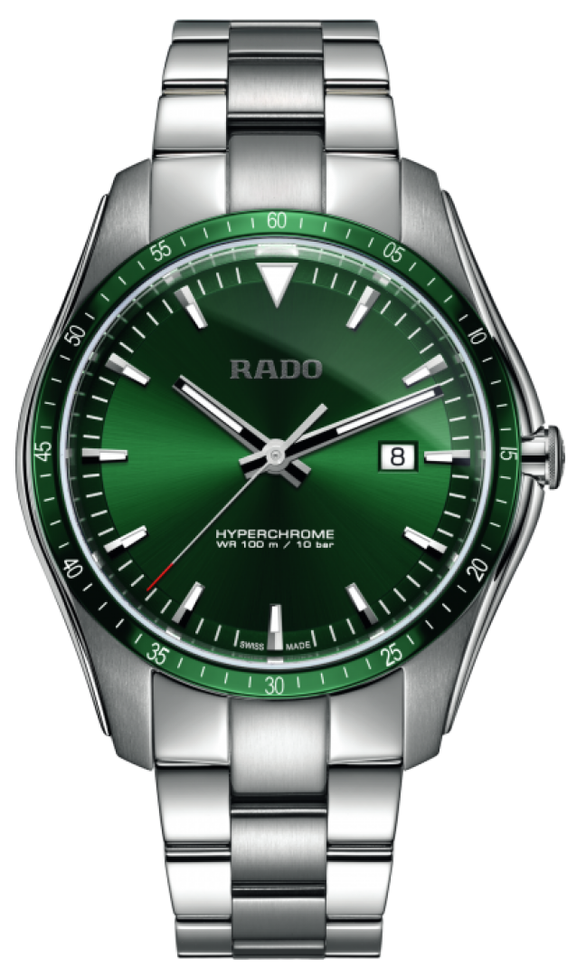 luxusní hodinky Rado Hyperchrome Quartz, Vodeodolnost 100M, 44.9 mm. Hodinky disponují funkcemi luminiscence a ukazatel data. Základní parametry hodinek jsou: typ strojku je Quartz hodinky, materiál řemínku je ocel, vodotěsnost je 100 m a barva číselníku je zelená.