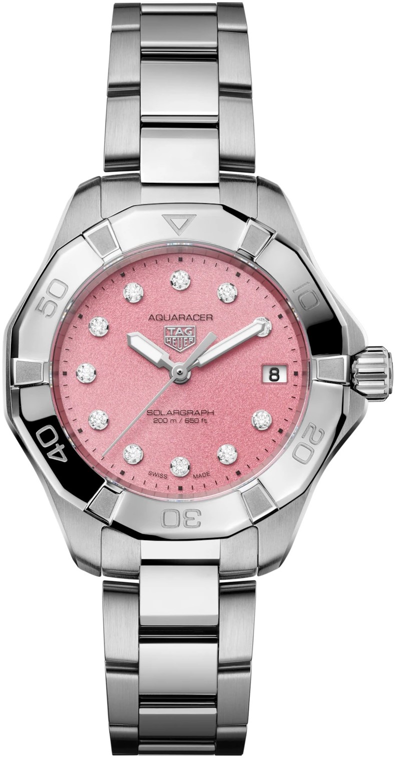 luxusní hodinky TAG Heuer Aquaracer Solargraph Diamanty, Quartz, Voděodolnost 200M, 34 mm. Hodinky disponují funkcemi luminiscence, ukazatel data a E.O.L.. Základní parametry hodinek jsou: typ strojku je Quartz hodinky, materiál řemínku je ocel, vodotěsnost je 200 m a barva číselníku je ružová.