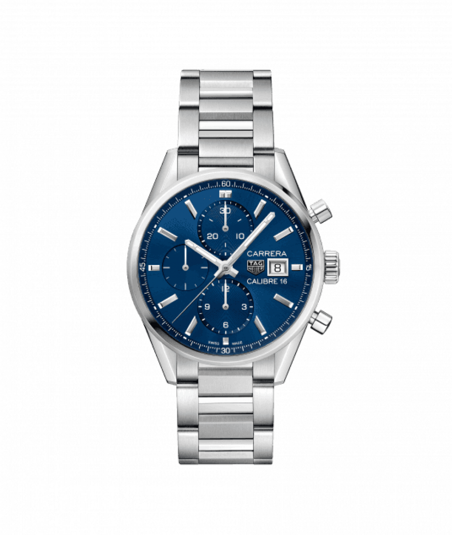 luxusní hodinky TAG Heuer Carrera Calibre 16, Vodotěsnost 100M, 41 mm. Hodinky disponují funkcemi luminiscence, stopky a ukazatel data. Základní parametry hodinek jsou: barva číselníku je modrá, typ strojku je mechanický chronograf s automatickým nátahem, materiál řemínku je ocel a vodotěsnost je 100 m.
