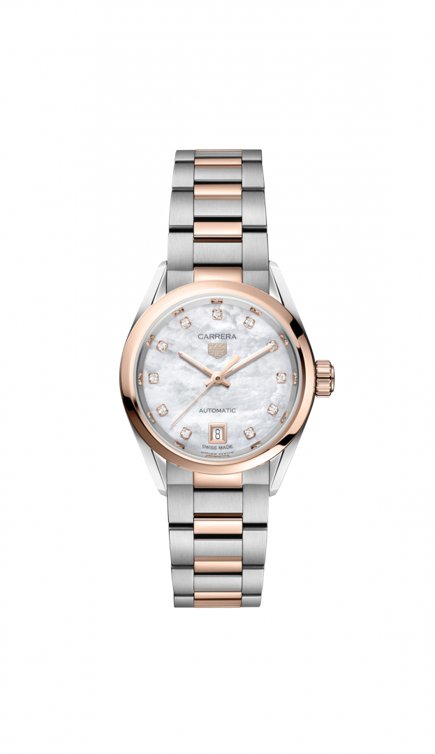luxusní hodinky TAG Heuer Carrera Calibre 9, vodotěsnost 100m, 29 mm. Hodinky disponují funkcemi ukazatel data. Základní parametry hodinek jsou: typ strojku je mechanické hodinky s automatickým nátahem, materiál řemínku je ocel a zlato, vodotěsnost je 100 m a barva číselníku je perleť.