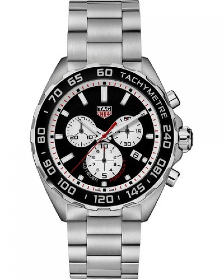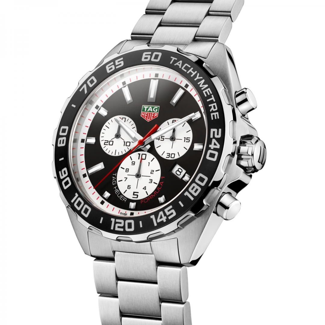 Luxusní hodinky TAG Heuer Formula 1 Quartz, Chronograf, Vodotěsnost 200M, 43 mm. Hodinky disponují funkcemi luminiscencia, stopky, tachymeter a ukazovateľ dátumu. Základní parametry hodinek jsou: barva číselníku je černá, typ strojku je Quartz chronograf, vodotěsnost je 200 m a materiál řemínku je ocel.