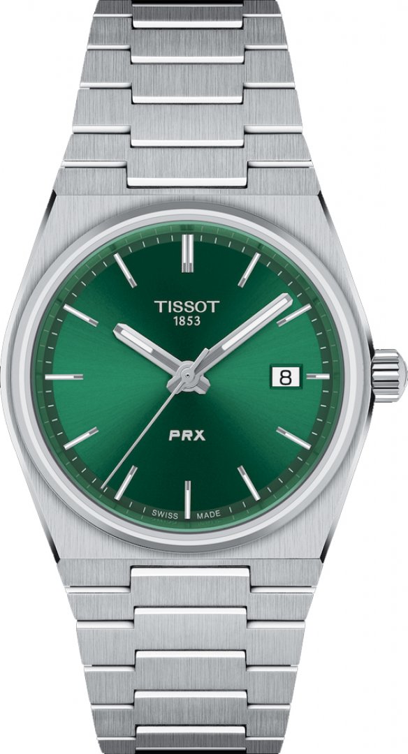 luxusní hodinky Tissot PRX Quartz, Vodotěsnost 100M, 35 mm. Hodinky disponují funkcemi ukazatel data. Základní parametry hodinek jsou: typ strojku je Quartz hodinky, vodotěsnost je 100 m, materiál řemínku je ocel a barva číselníku je zelená.