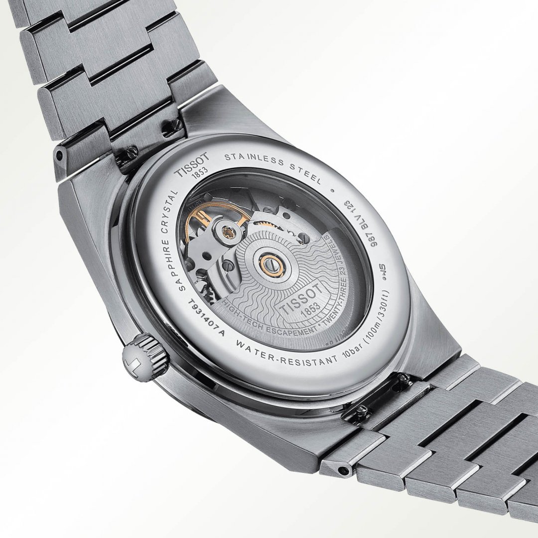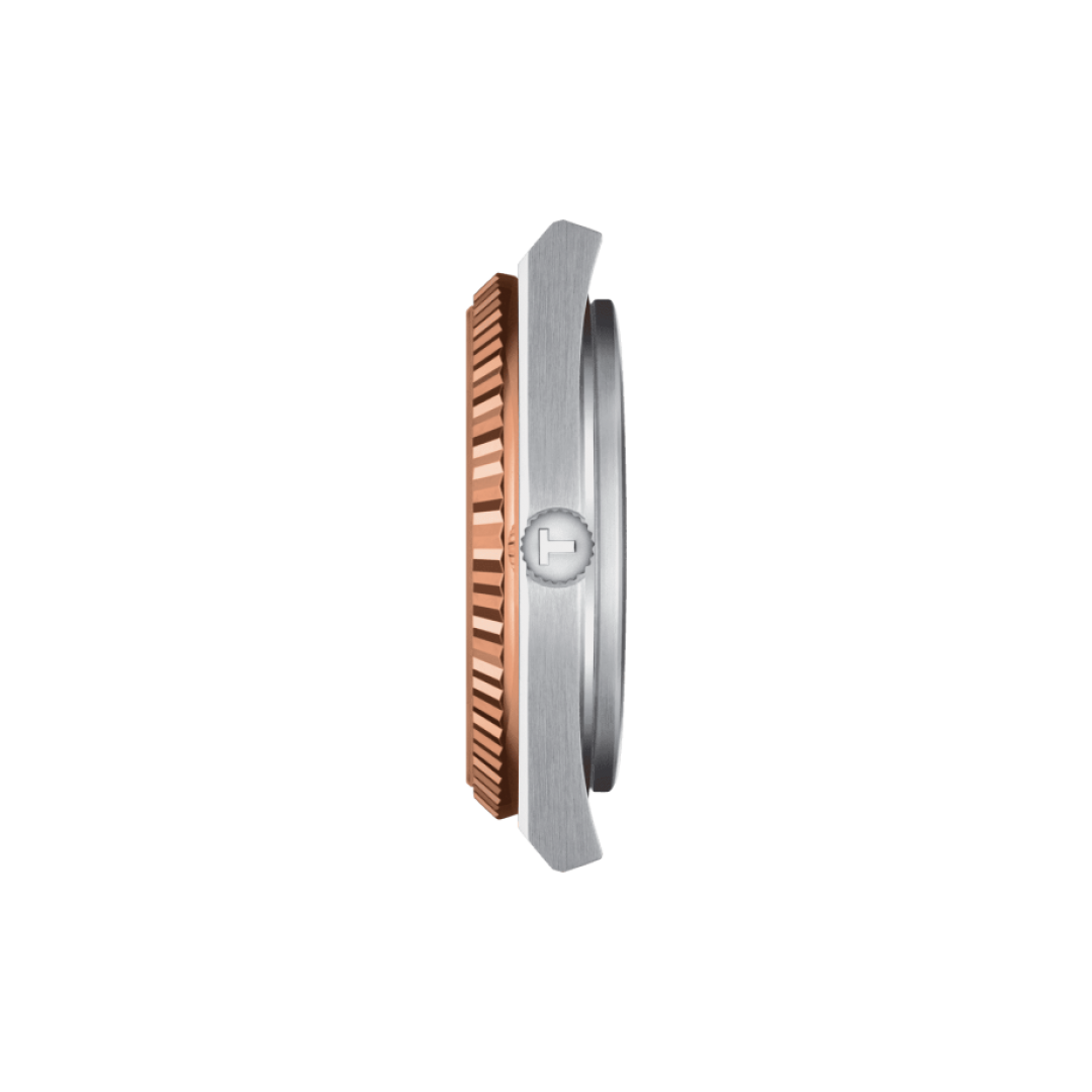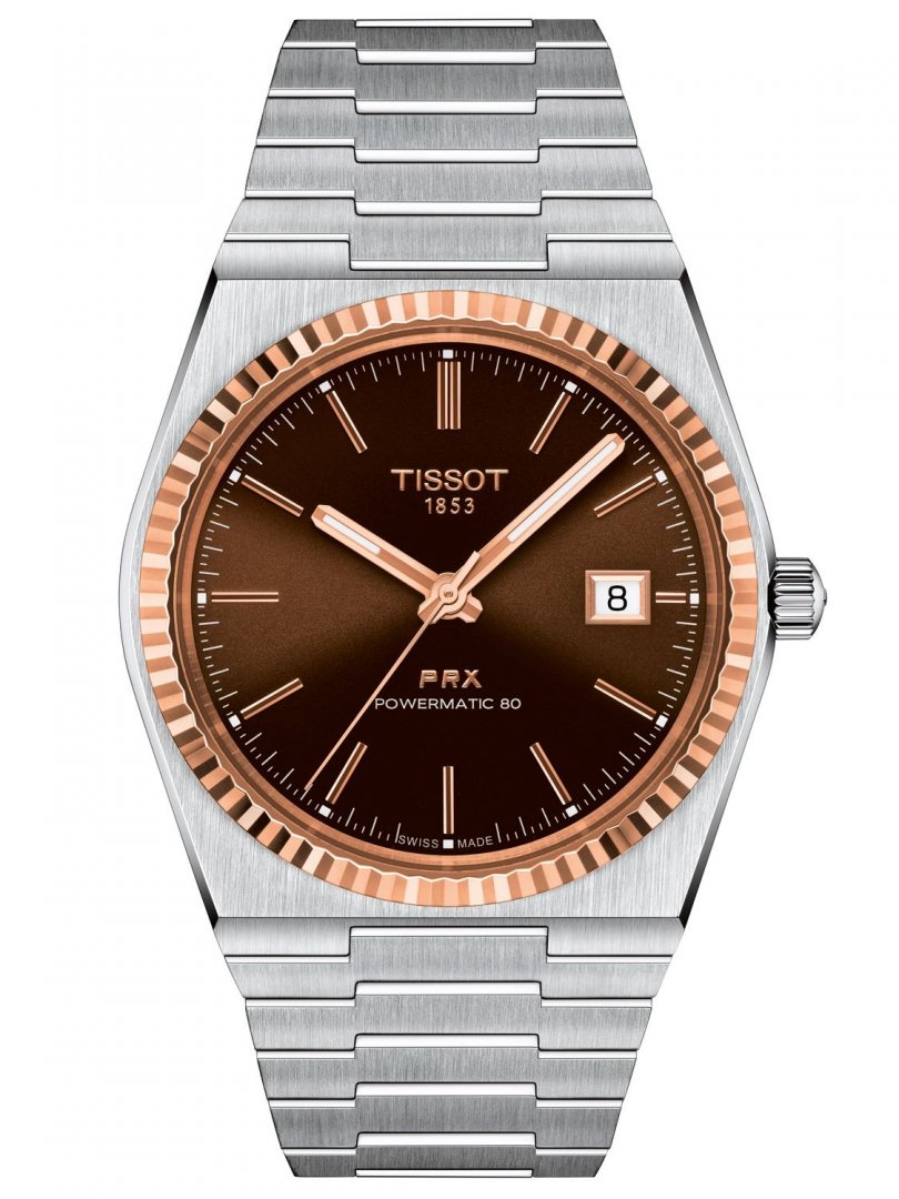 sportovní hodinky Tissot PRX AUTOMATIC Zlatá luneta, 40 mm. Hodinky disponují funkcemi ukazatel data. Základní parametry hodinek jsou: materiál řemínku je ocel, vodotěsnost je 100 m, typ strojku je mechanické hodinky s automatickým nátahem a barva číselníku je bronzová.