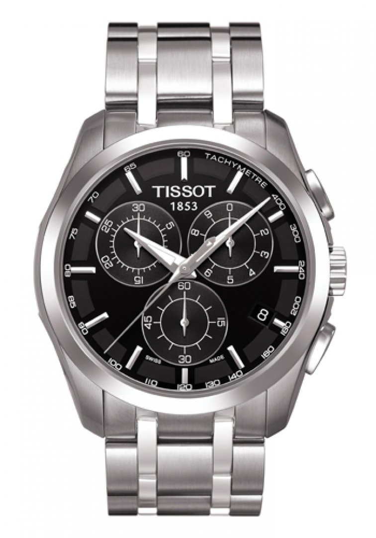 Luxusní hodinky Tissot T-Classic COUTURIER, Quartz Chronograf, 41 mm. Hodinky disponují funkcemi luminiscencia, stopky, tachymeter a ukazovateľ dátumu. Základní parametry hodinek jsou: barva číselníku je černá, typ strojku je Quartz chronograf, materiál řemínku je ocel a vodotěsnost je 100 m.