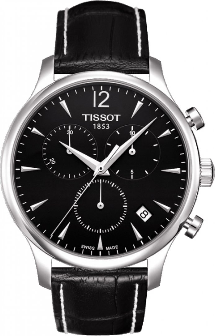 Luxusní hodinky Tissot T-Classic TRADITION, Quartz Chronograf, 42 mm. Hodinky disponují funkcemi stopky a ukazovateľ dátumu. Základní parametry hodinek jsou: typ strojku je Quartz chronograf, materiál řemínku je kůže, vodotěsnost je 30 m a barva číselníku je černá.