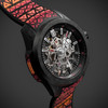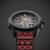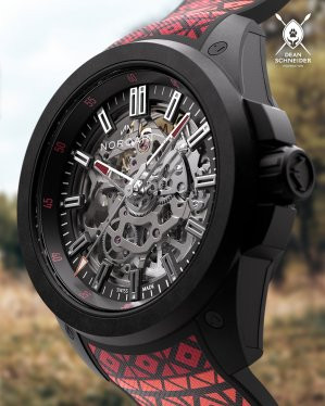 Im Herzen der Uhr arbeitet das Automatikwerk NORQAIN Calibre NO8S, das Sellita für die Marke liefert. Das COSC-zertifizierte Chronometerwerk verfügt über eine Gangreserve von 41 Stunden. Das Uhrenglas besteht aus Saphirglas, das bei den widerstandsfähigsten Uhren ein Muss ist, und auch hier bildet es keine Ausnahme. Die Zeiger und Indizes auf dem skelettierten Zifferblatt sind mit Super-LumiNova beschichtet, was das Ablesen der Uhr bei schlechten Lichtverhältnissen erleichtert. Die orangefarbene Kontur des Sekundenzeigers und die roten Details sind eine subtile Anspielung auf die Farbenwelt von Hakuna Mipaka und den umliegenden afrikanischen Stämmen.