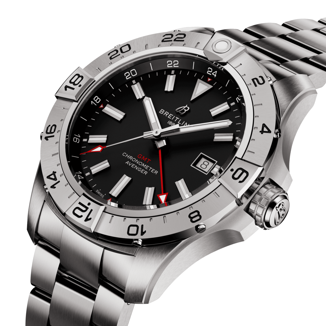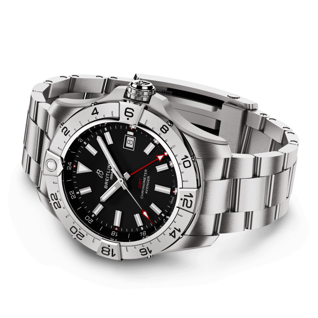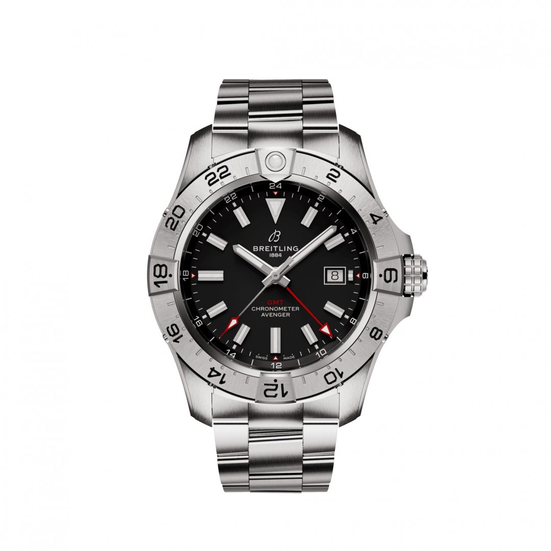 Breitling Avenger Automatic 44 GMT Automatik, Wasserdicht 300M, 44 mm. Die Uhr hat folgende Funktionen: Lumineszenz, Datum und Dualzeit. Die Grundparameter der Uhr sind: wasserabweisend ist 300 m, bewegungsart ist mechanische Uhr mit automatischem Aufzug, armbandmaterial ist Stahl und ziffernblattfarbe ist schwarz.