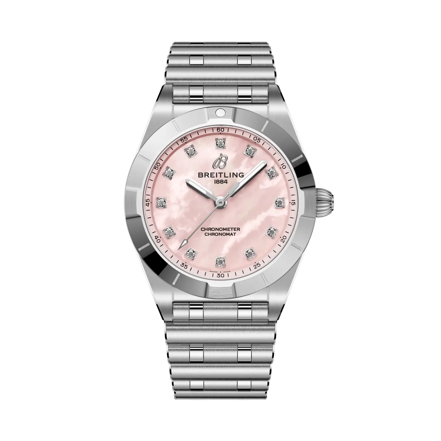 Breitling Chronomat 28 Dimanaten, Quartz, 28 mm. Die Uhr hat folgende Funktionen: Lumineszenz, Datum und E.O.L.. Die Grundparameter der Uhr sind: armbandmaterial ist Stahl, wasserabweisend ist 100 m, ziffernblattfarbe ist rosa und bewegungsart ist Quarzuhren.