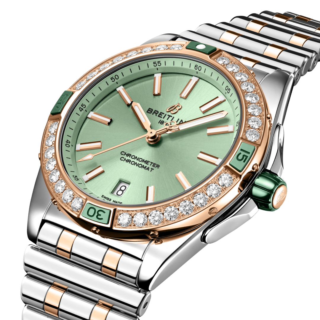 Breitling Chronomat Automatic 38 Goldene&Diamanten, 38 mm. Die Uhr hat folgende Funktionen: Lumineszenz und Datum . Die Grundparameter der Uhr sind: bewegungsart ist mechanische Uhr mit automatischem Aufzug, armbandmaterial ist Stahl und Gold, wasserabweisend ist 100 m und ziffernblattfarbe ist grün.