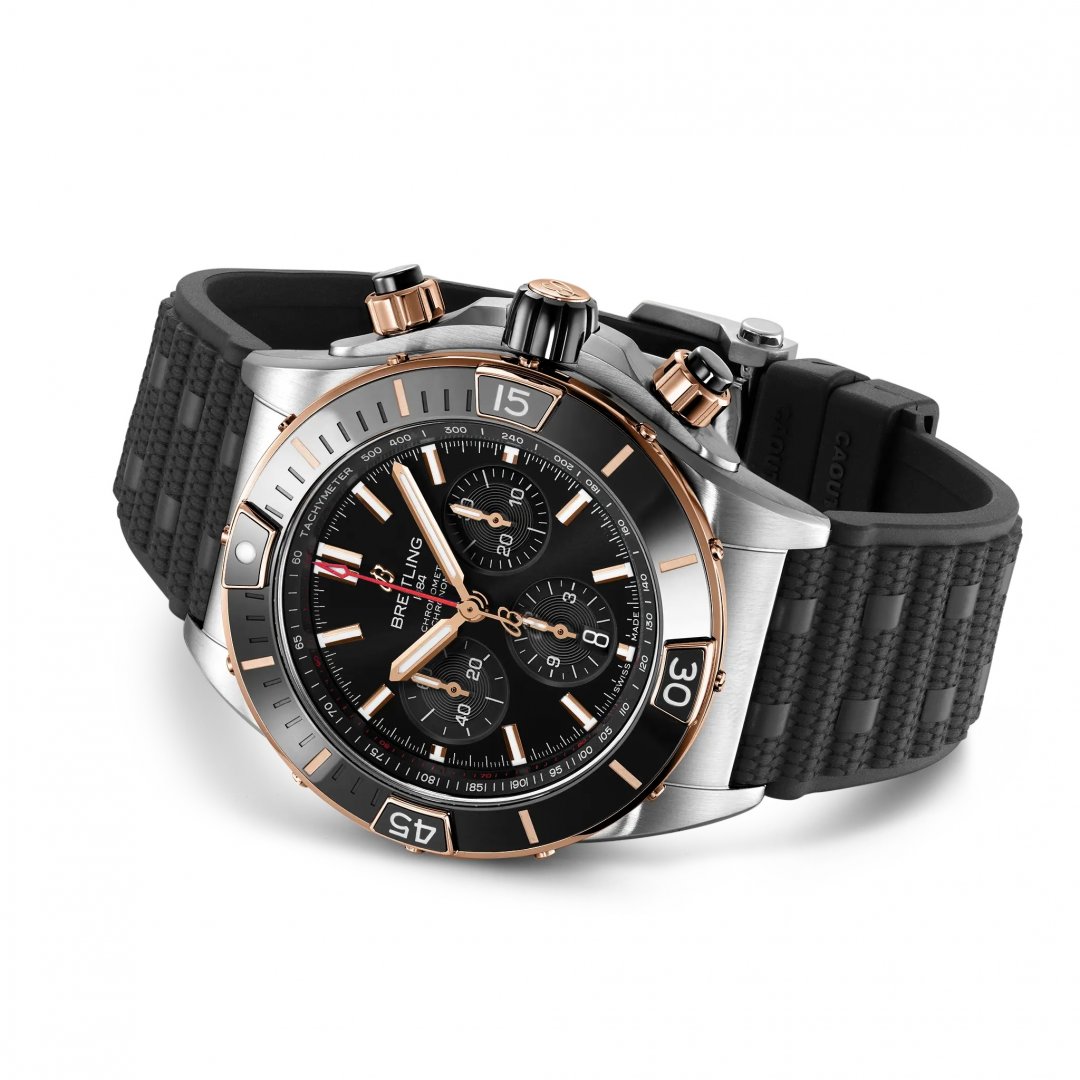 Breitling Chronomat Super Chronomat B01 In-house calibre, Wasserdicht 200M, 44 mm. Die Uhr hat folgende Funktionen: Lumineszenz, Stoppuhr, Datum und Tachymeter-Skala. Die Grundparameter der Uhr sind: bewegungsart ist mechanischer Chronograph mit automatischem Aufzug, wasserabweisend ist 200 m, ziffernblattfarbe ist schwarz und armbandmaterial ist Gummi.
