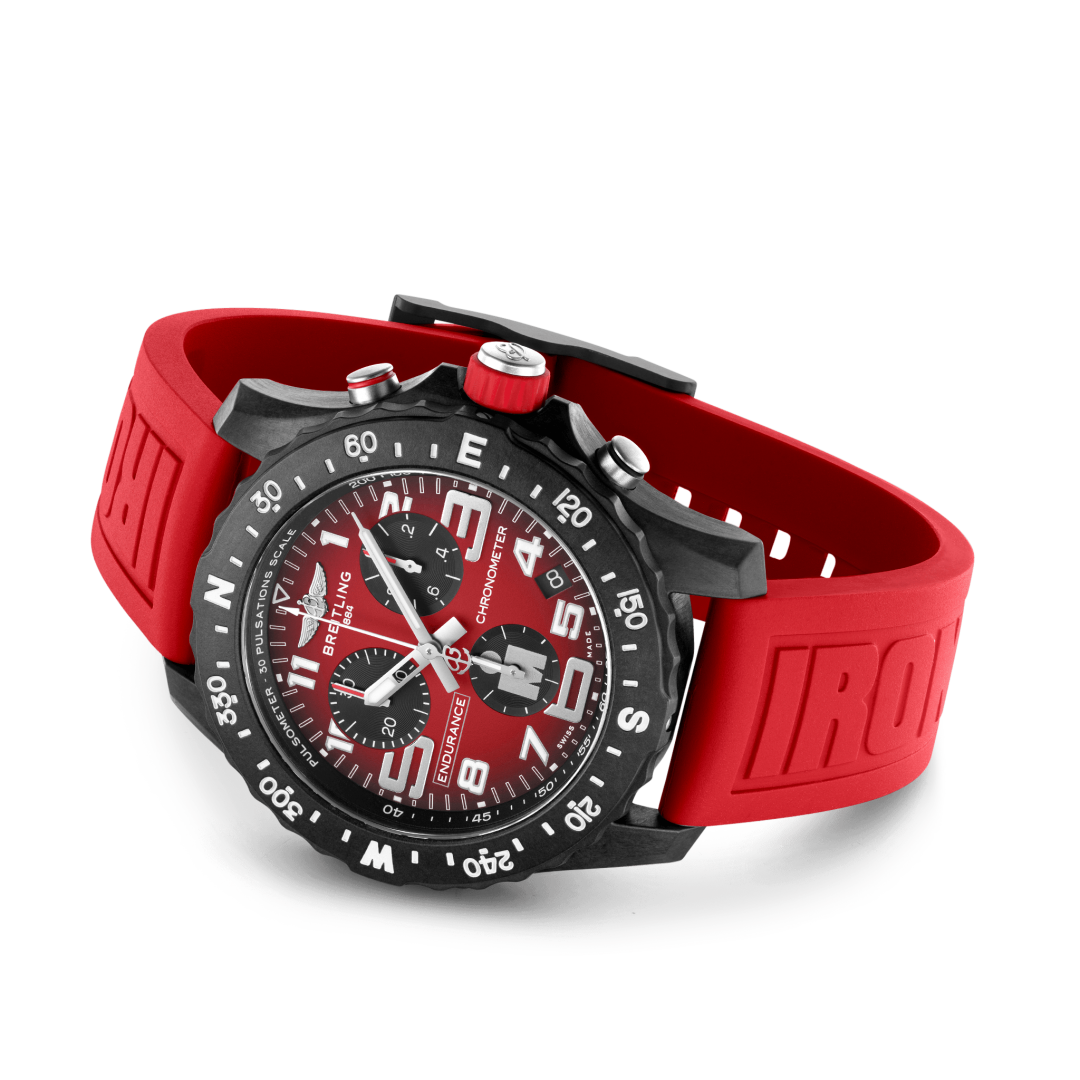 Breitling Endurance Pro Breitlight® - IRONMAN® . Die Uhr hat folgende Funktionen: Lumineszenz, Stoppuhr, Datum und E.O.L.. Die Grundparameter der Uhr sind: ziffernblattfarbe ist schwarz und rot, armbandmaterial ist Gummi, wasserabweisend ist 100 m und bewegungsart ist Quarz-Chronograph.