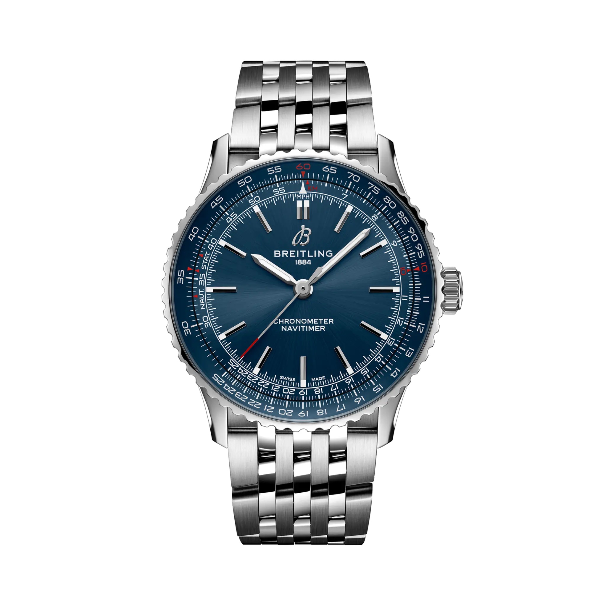 Breitling Navitimer Automatic 41 Automatik. Die Uhr hat folgende Funktionen: Lumineszenz, Datum und Rechenschieber. Die Grundparameter der Uhr sind: bewegungsart ist mechanische Uhr mit automatischem Aufzug, wasserabweisend ist 30 m, ziffernblattfarbe ist blau und armbandmaterial ist Stahl.