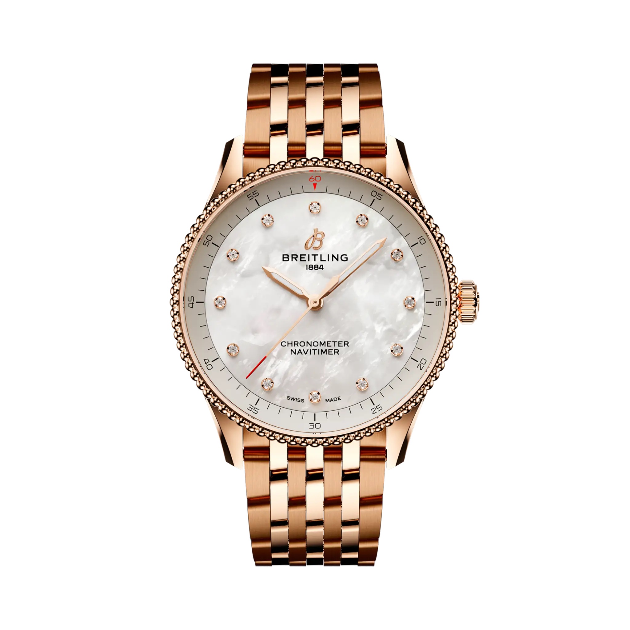 Breitling Navitimer 32 Gold & Diamante, Quartz, 32 mm. Die Uhr hat folgende Funktionen: Lumineszenz und E.O.L.. Die Grundparameter der Uhr sind: wasserabweisend ist 30 m, ziffernblattfarbe ist perlmuttern, bewegungsart ist Quarzuhren und armbandmaterial ist Gold.