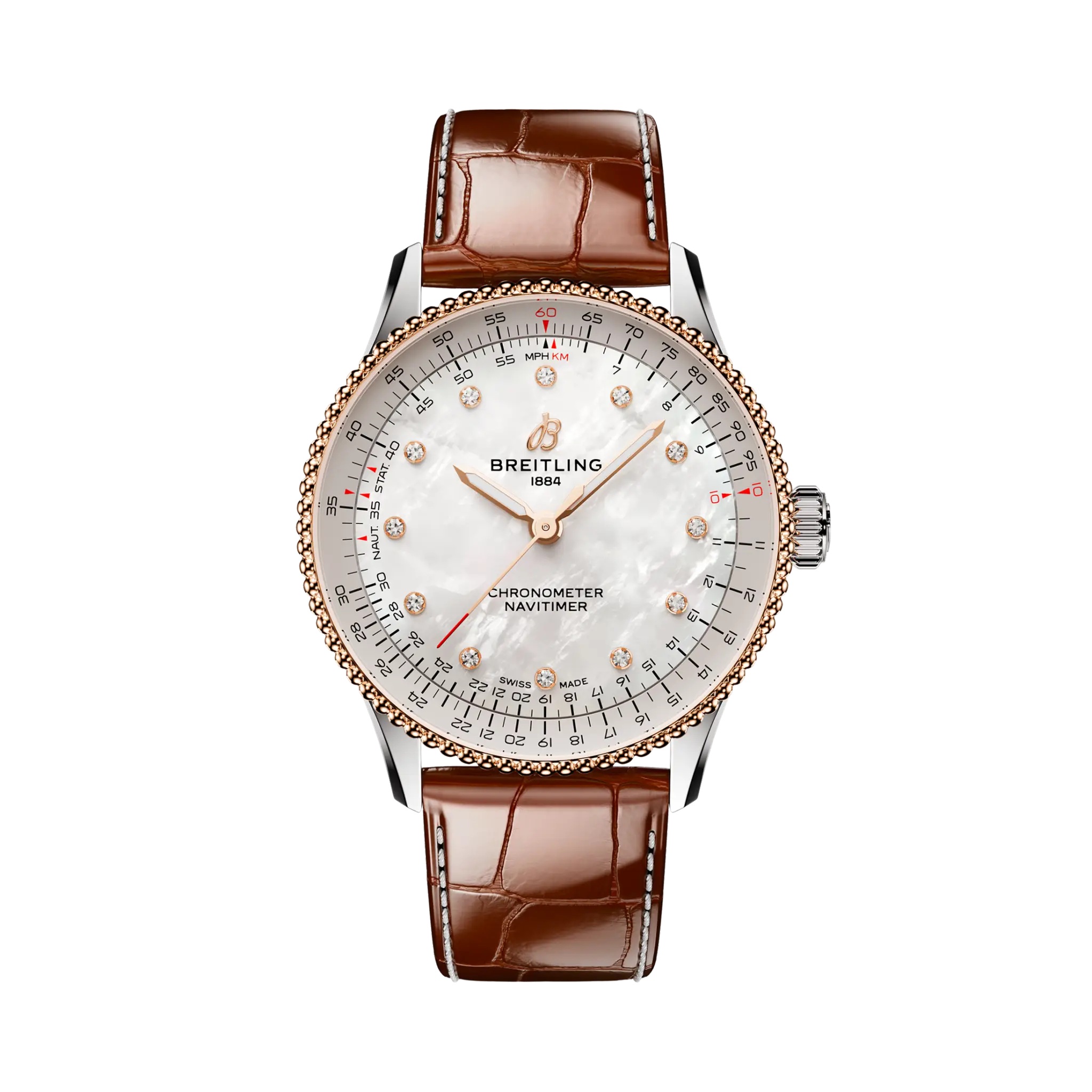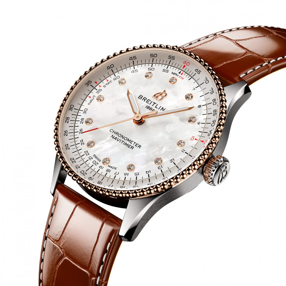 Breitling Navitimer Automatic 36 Gold & Diamanten, Automatik, 36 mm. Die Uhr hat folgende Funktionen: Lumineszenz. Die Grundparameter der Uhr sind: bewegungsart ist mechanische Uhr mit automatischem Aufzug, wasserabweisend ist 30 m, armbandmaterial ist Leder und ziffernblattfarbe ist perlmuttern.