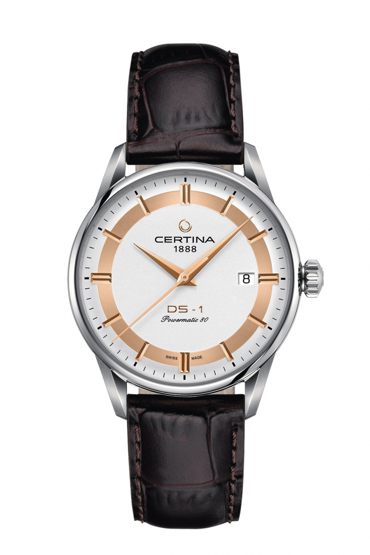 Certina DS-1 . Die Uhr hat folgende Funktionen: Lumineszenz und Datum . Die Grundparameter der Uhr sind: ziffernblattfarbe ist silbern und golden, bewegungsart ist mechanische Uhr mit automatischem Aufzug, wasserabweisend ist 100 m und armbandmaterial ist Leder.
