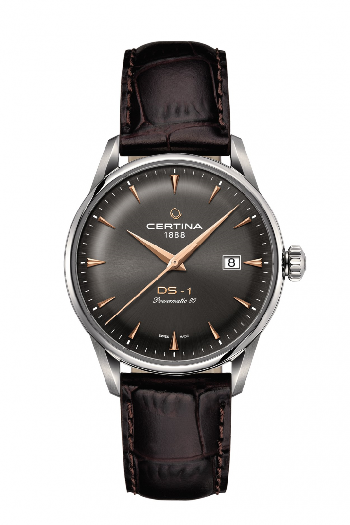Certina DS-1 . Die Uhr hat folgende Funktionen: Lumineszenz und Datum . Die Grundparameter der Uhr sind: bewegungsart ist mechanische Uhr mit automatischem Aufzug, wasserabweisend ist 100 m, armbandmaterial ist Leder und ziffernblattfarbe ist grau.