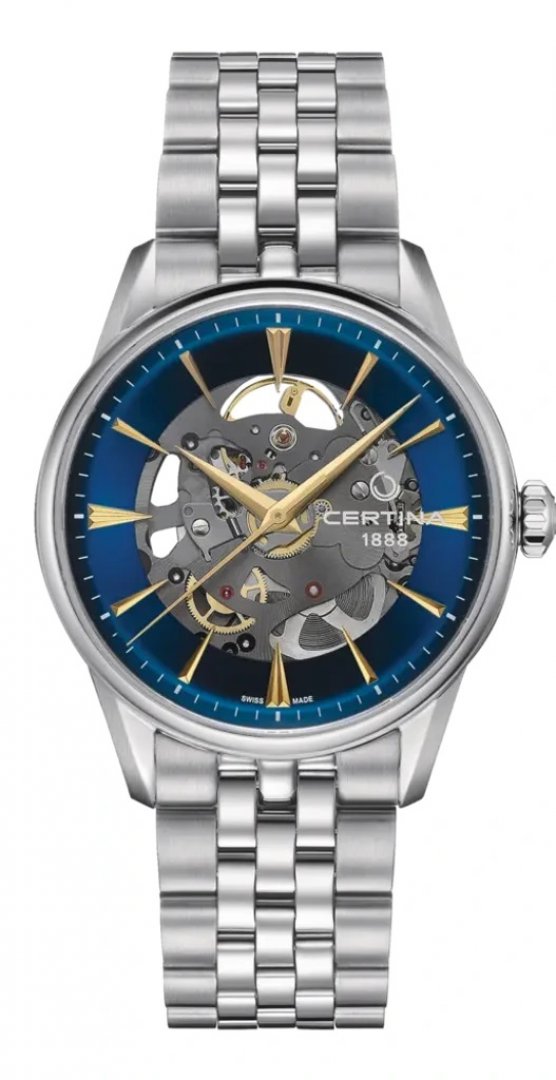 Certina DS-1 Skeleton Powermatic 80, Wasserdicht 100M, 40 mm. Die Grundparameter der Uhr sind: ziffernblattfarbe ist transparent und blau, bewegungsart ist mechanische Uhr mit automatischem Aufzug, wasserabweisend ist 100 m und armbandmaterial ist Stahl.