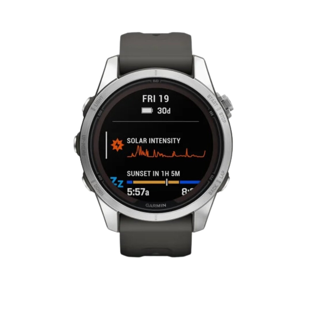 Garmin Fénix 7 S Pro Solar, Silver Stainless Steel, Graphite Band 42 mm. Die Uhr hat folgende Funktionen: Alarm, Barometer, GPS, Tiefenmesser, Datum, Kompass, Herzfrequenzüberwachung, Beleuchtung, Countdown, Stoppuhr, Weltzeit, Tachymeter-Skala, Thermometer, Trainingsfunktionen, Datum , ewiger Kalender, Höhenmesser , multifunktional, GPS , GLONASS , GALILEO, Akcelerometer, Garmin Pay™, hochempfindlicher Empfänger, Option zum Hochladen von Karten, Bluetooth®, Wi-Fi®, MP3-Spieler, Touchscreen, Strava-Segment und LED Baterka. Die Grundparameter der Uhr sind: bewegungsart ist spezial, armbandmaterial ist Silikon und wasserabweisend ist 100 m.