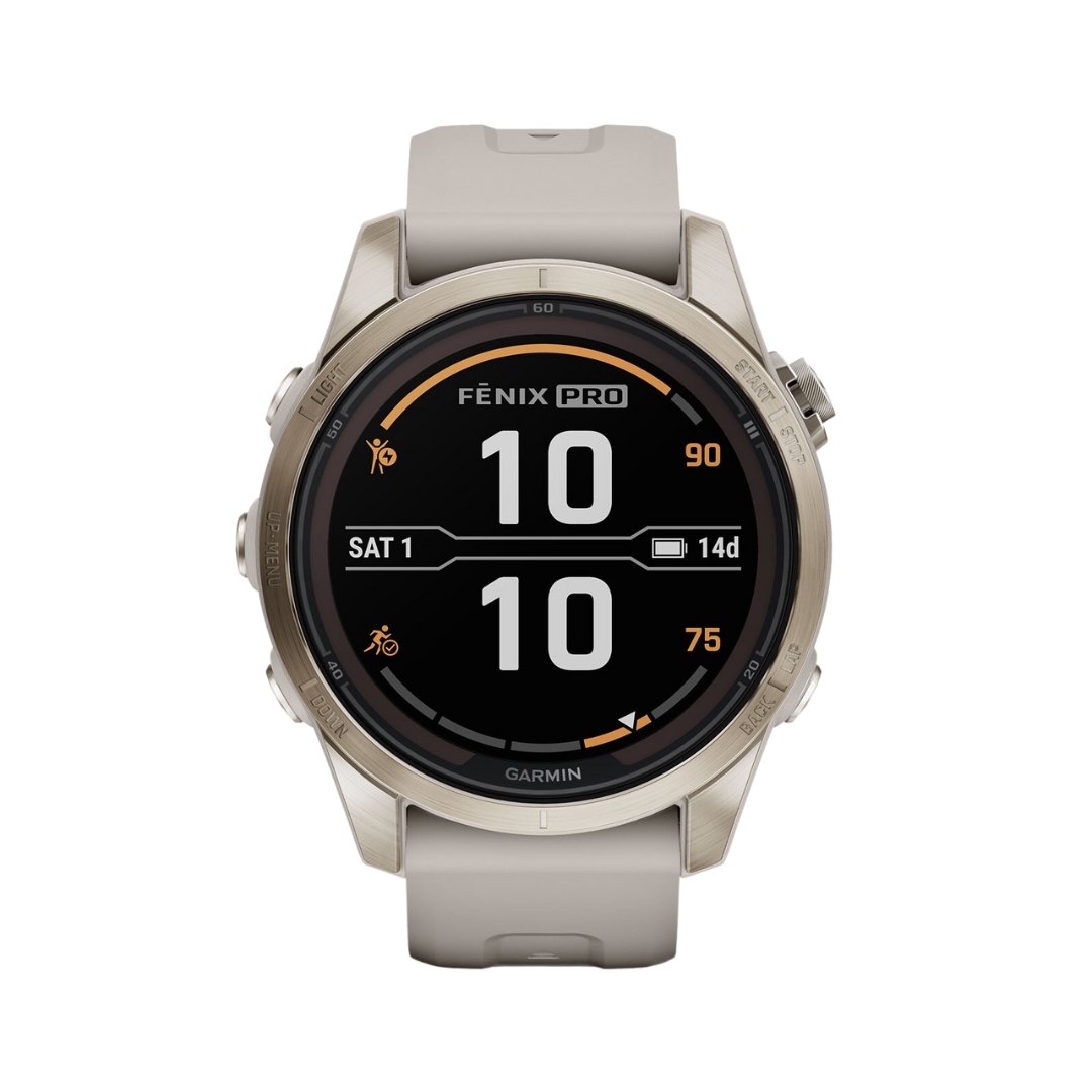 Garmin Fénix 7 S Pro Sapphire Solar, Soft Gold Stainless Steel, Light Sand Band Garmin Fénix. Die Uhr hat folgende Funktionen: Alarm, Barometer, GPS, Tiefenmesser, Datum, Kompass, Herzfrequenzüberwachung, Beleuchtung, Countdown, Stoppuhr, Weltzeit, Tachymeter-Skala, Thermometer, Trainingsfunktionen, Datum , ewiger Kalender, Höhenmesser , multifunktional, GPS , GLONASS , GALILEO, Akcelerometer, Garmin Pay™, hochempfindlicher Empfänger, Option zum Hochladen von Karten, Bluetooth®, Wi-Fi®, MP3-Spieler, Touchscreen, Strava-Segment und LED Baterka. Die Grundparameter der Uhr sind: bewegungsart ist spezial, armbandmaterial ist Silikon und wasserabweisend ist 100 m.