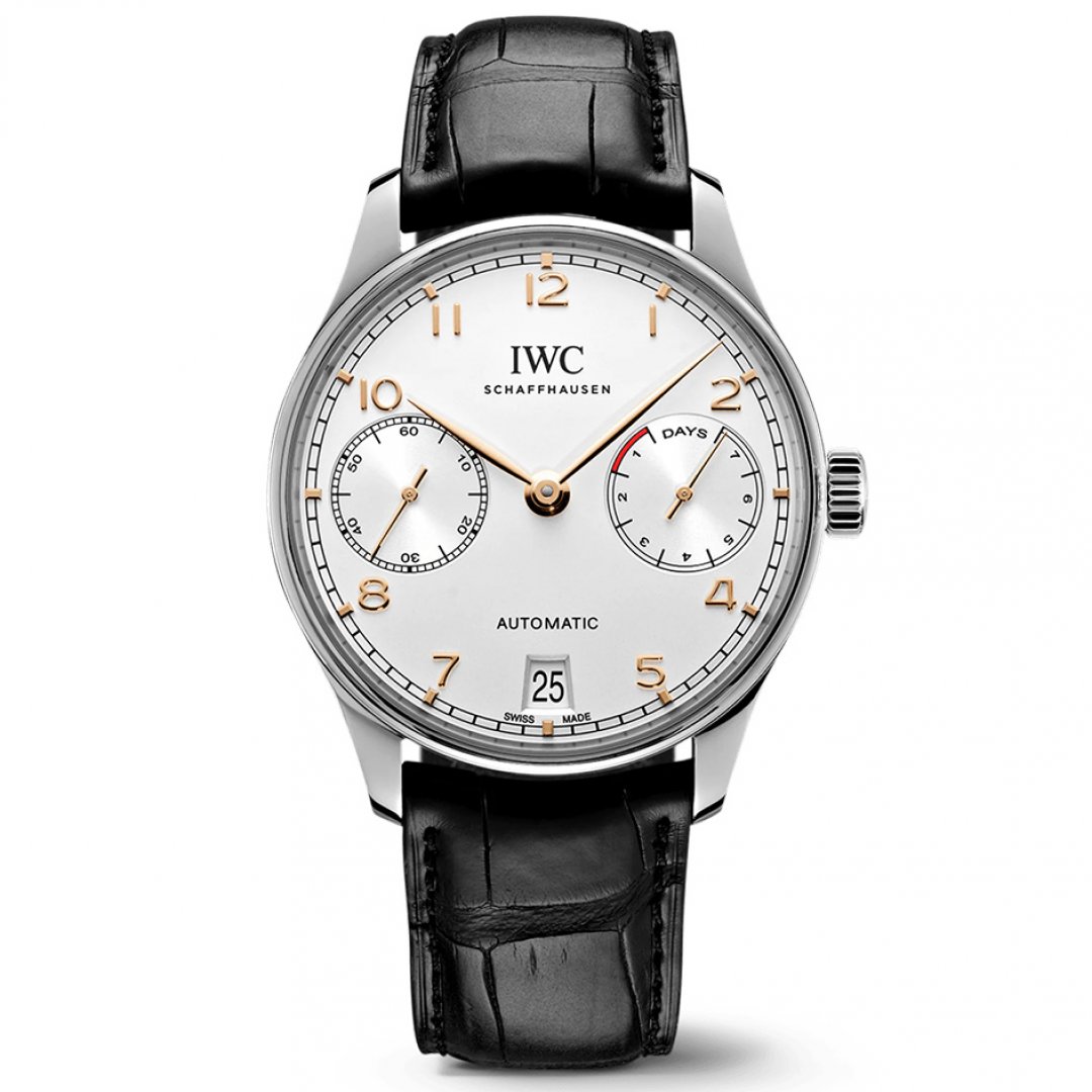 IWC Schaffhausen Portugieser . Die Uhr hat folgende Funktionen: Datum und Energiereserve. Die Grundparameter der Uhr sind: ziffernblattfarbe ist silbern, bewegungsart ist mechanische Uhr mit automatischem Aufzug, armbandmaterial ist Leder und wasserabweisend ist 30 m.