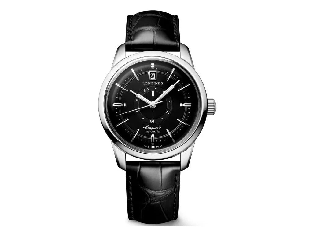 Longines Conquest Heritage Automatik, 38mm. Die Uhr hat folgende Funktionen: Lumineszenz und Datum . Die Grundparameter der Uhr sind: ziffernblattfarbe ist schwarz, bewegungsart ist mechanische Uhr mit automatischem Aufzug, armbandmaterial ist Leder und wasserabweisend ist 50 m.