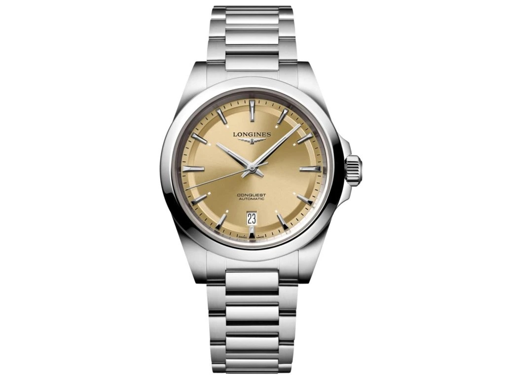 Longines Conquest Automatik, 38 mm. Die Uhr hat folgende Funktionen: Datum . Die Grundparameter der Uhr sind: bewegungsart ist mechanische Uhr mit automatischem Aufzug, armbandmaterial ist Stahl, wasserabweisend ist 100 m und ziffernblattfarbe ist golden.