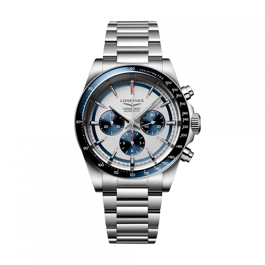 Longines Conquest Chronograph Automatik, Wasserdicht 100M, 42 mm. Die Uhr hat folgende Funktionen: Lumineszenz, Stoppuhr und Tachymeter-Skala. Die Grundparameter der Uhr sind: bewegungsart ist mechanischer Chronograph mit automatischem Aufzug, armbandmaterial ist Stahl, wasserabweisend ist 100 m und ziffernblattfarbe ist silbern.