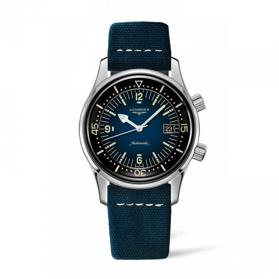 Longines Heritage Legend Diver . Die Uhr hat folgende Funktionen: Lumineszenz und Datum . Die Grundparameter der Uhr sind: ziffernblattfarbe ist schwarz und blau, bewegungsart ist mechanische Uhr mit automatischem Aufzug, armbandmaterial ist Leder und Textilien und wasserabweisend ist 300 m.