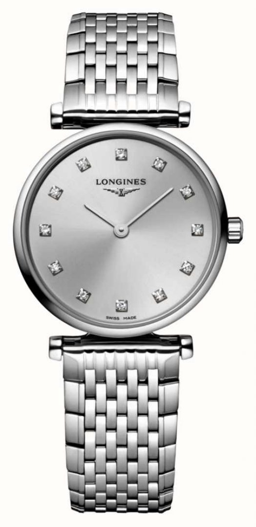 Longines La Grande Classique de Longines Diamante, Quartz, 24 mm. Die Grundparameter der Uhr sind: ziffernblattfarbe ist silbern, bewegungsart ist Quarzuhren, armbandmaterial ist Stahl und wasserabweisend ist 30 m.