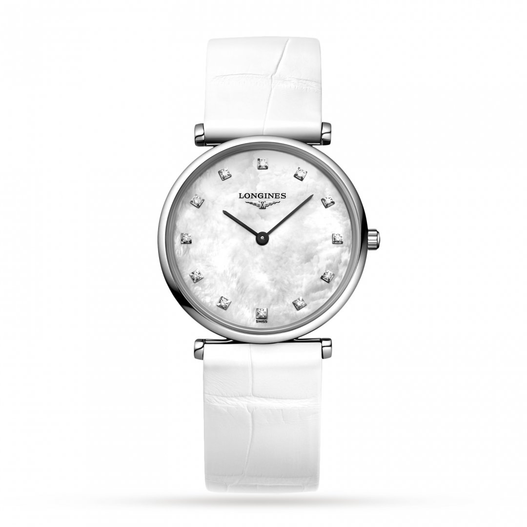 Longines La Grande Classique de Longines . Die Grundparameter der Uhr sind: ziffernblattfarbe ist perlmuttern, bewegungsart ist Quarzuhren, armbandmaterial ist Leder und wasserabweisend ist 30 m.