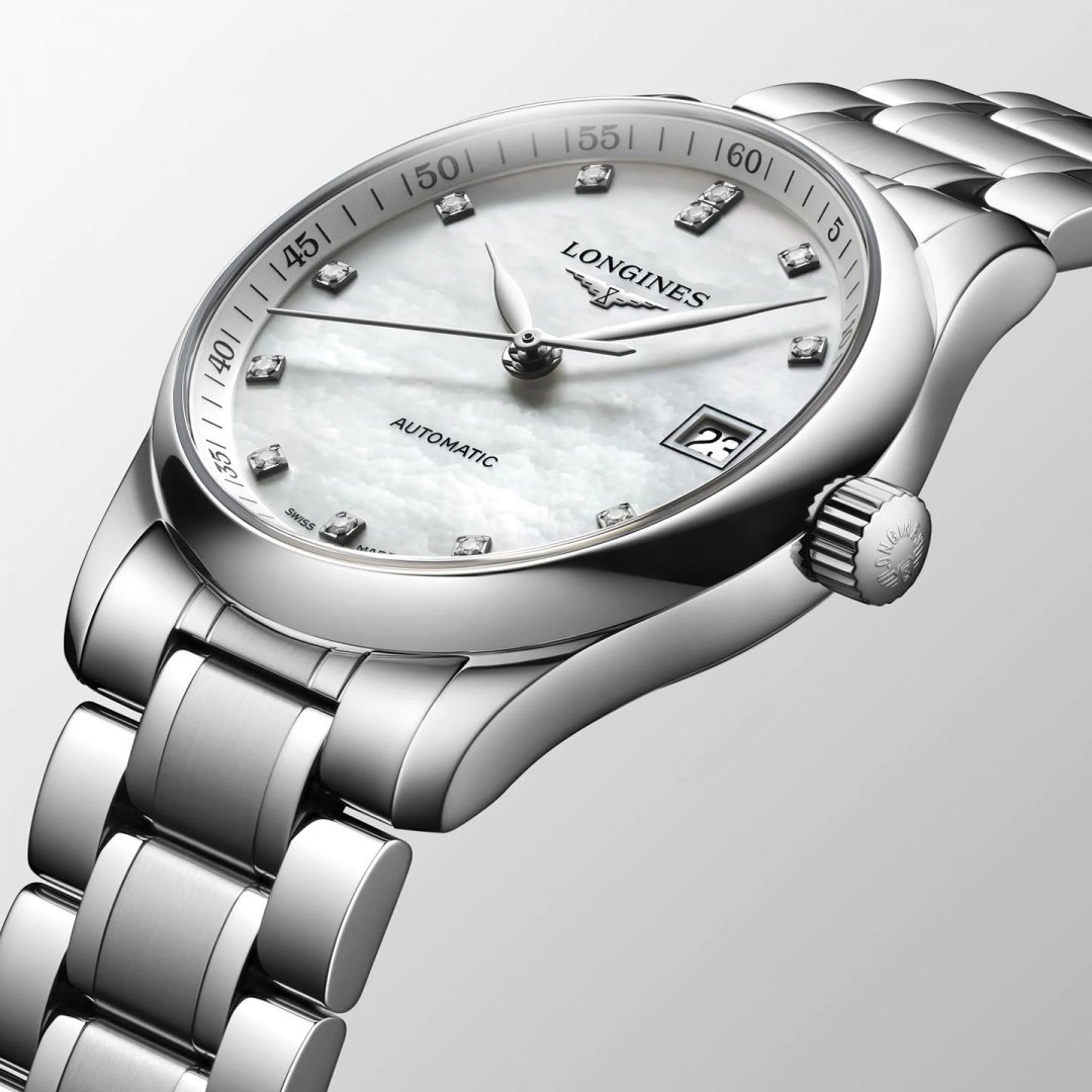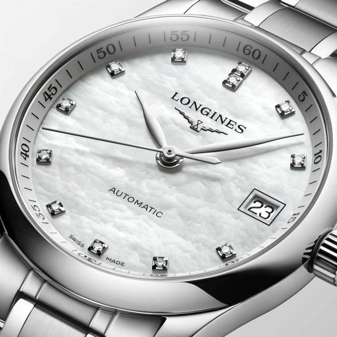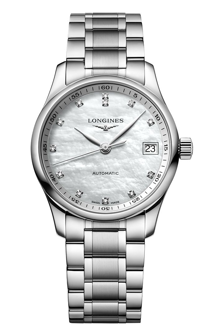 Longines Master Collection Diamanten, Automatik, 34 mm. Die Uhr hat folgende Funktionen: Datum . Die Grundparameter der Uhr sind: bewegungsart ist mechanische Uhr mit automatischem Aufzug, wasserabweisend ist 30 m, armbandmaterial ist Stahl und ziffernblattfarbe ist perlmuttern.