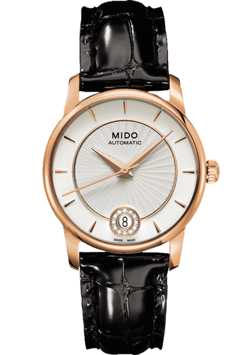Mido Baroncelli Diamonds . Die Uhr hat folgende Funktionen: Datum . Die Grundparameter der Uhr sind: bewegungsart ist mechanische Uhr mit automatischem Aufzug, armbandmaterial ist Leder, wasserabweisend ist 50 m und ziffernblattfarbe ist silbern.