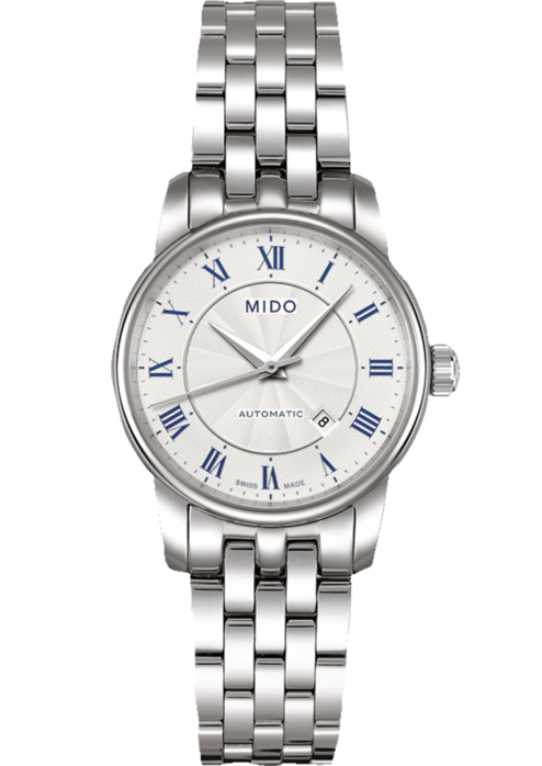 Mido Baroncelli . Die Uhr hat folgende Funktionen: Datum . Die Grundparameter der Uhr sind: bewegungsart ist mechanische Uhr mit automatischem Aufzug, armbandmaterial ist Stahl, wasserabweisend ist 50 m und ziffernblattfarbe ist silbern.