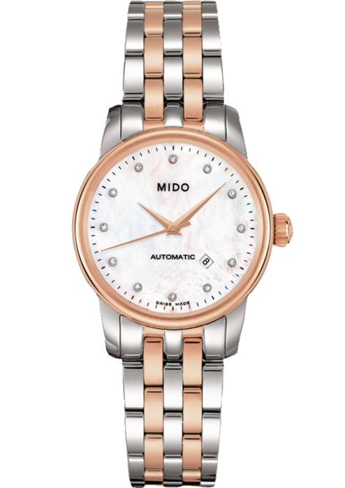 Mido Baroncelli . Die Uhr hat folgende Funktionen: Datum . Die Grundparameter der Uhr sind: ziffernblattfarbe ist perlmuttern, bewegungsart ist mechanische Uhr mit automatischem Aufzug, armbandmaterial ist Stahl und wasserabweisend ist 50 m.
