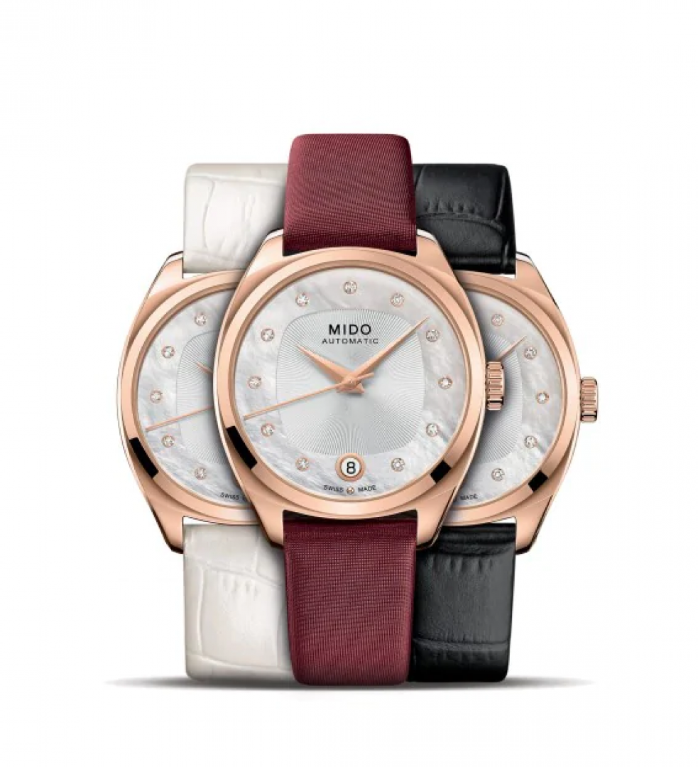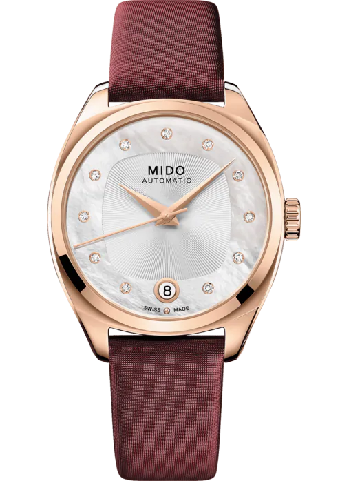 Mido Belluna Royal Lady . Die Uhr hat folgende Funktionen: Datum . Die Grundparameter der Uhr sind: bewegungsart ist mechanische Uhr mit automatischem Aufzug, wasserabweisend ist 30 m, armbandmaterial ist Leder und ziffernblattfarbe ist perlmuttern.