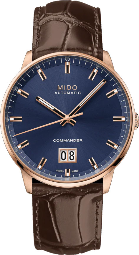 Mido Commander Big Date Automat, 42 mm. Die Uhr hat folgende Funktionen: Datum und Lumineszenz. Die Grundparameter der Uhr sind: bewegungsart ist mechanische Uhr mit automatischem Aufzug, wasserabweisend ist 50 m, ziffernblattfarbe ist blau und armbandmaterial ist Leder.