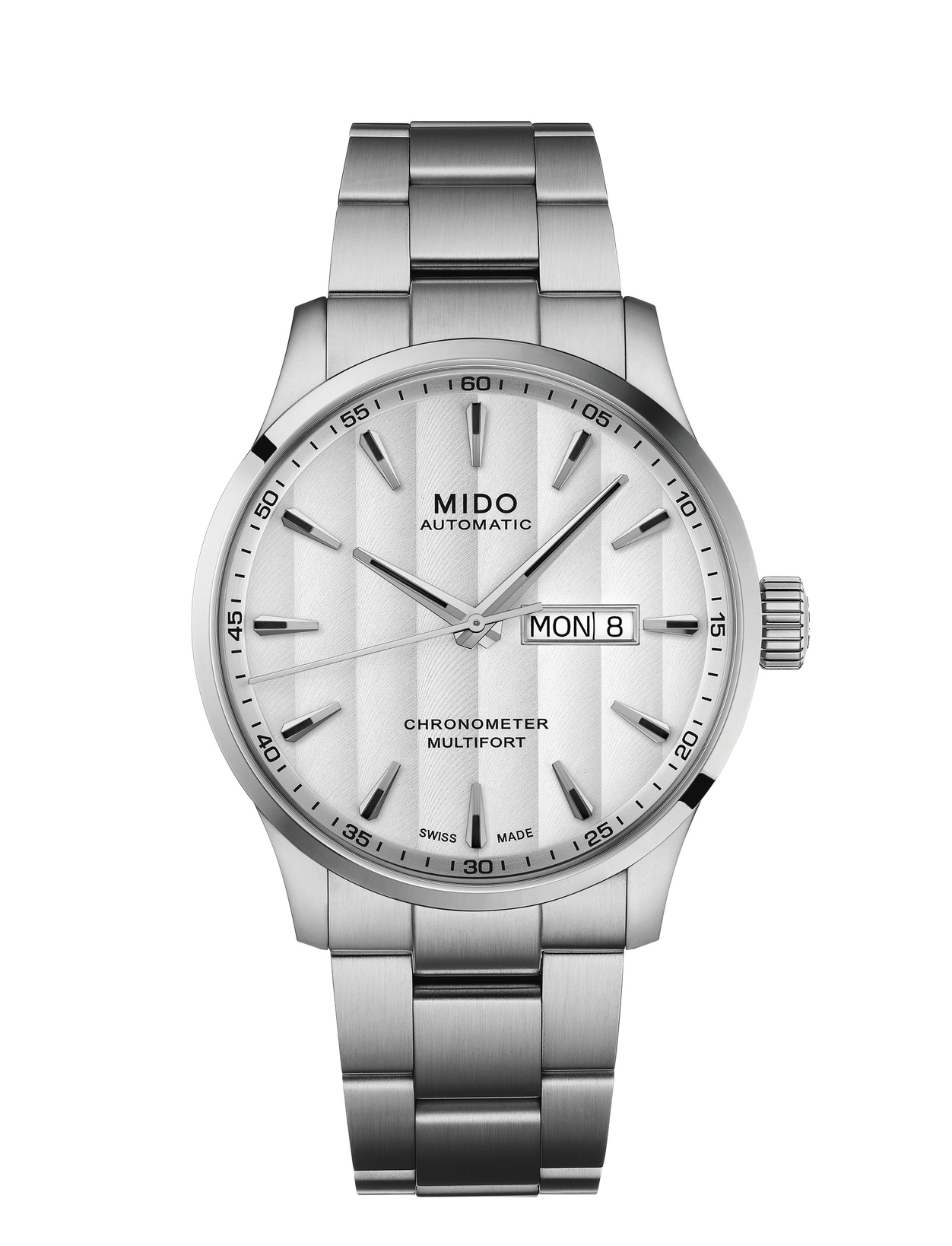 Mido Multifort . Die Uhr hat folgende Funktionen: Datum und Day-Date. Die Grundparameter der Uhr sind: bewegungsart ist mechanische Uhr mit automatischem Aufzug, wasserabweisend ist 100 m, armbandmaterial ist Stahl und ziffernblattfarbe ist silbern.