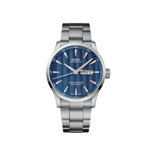 Mido Multifort . Die Uhr hat folgende Funktionen: Datum und Day-Date. Die Grundparameter der Uhr sind: bewegungsart ist mechanische Uhr mit automatischem Aufzug, wasserabweisend ist 100 m, ziffernblattfarbe ist blau und armbandmaterial ist Stahl.