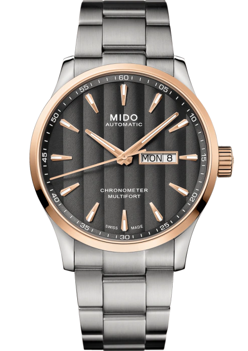 Mido Multifort . Die Uhr hat folgende Funktionen: Datum und Day-Date. Die Grundparameter der Uhr sind: bewegungsart ist mechanische Uhr mit automatischem Aufzug, wasserabweisend ist 100 m, armbandmaterial ist Stahl und ziffernblattfarbe ist grau.