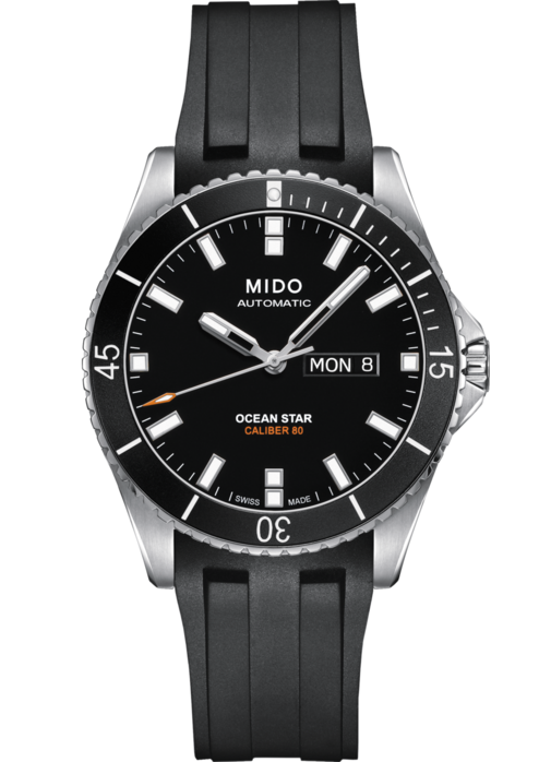 Mido Ocean Star . Die Uhr hat folgende Funktionen: Lumineszenz, Datum und Day-Date. Die Grundparameter der Uhr sind: bewegungsart ist mechanische Uhr mit automatischem Aufzug, wasserabweisend ist 200 m, ziffernblattfarbe ist schwarz und armbandmaterial ist Gummi.