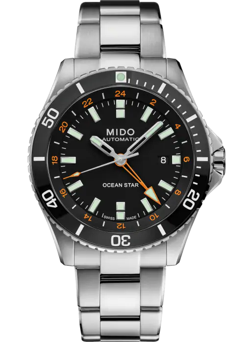 Mido Ocean Star . Die Uhr hat folgende Funktionen: Dualzeit, Lumineszenz und Datum . Die Grundparameter der Uhr sind: ziffernblattfarbe ist schwarz, bewegungsart ist mechanische Uhr mit automatischem Aufzug, armbandmaterial ist Stahl und wasserabweisend ist 200 m.
