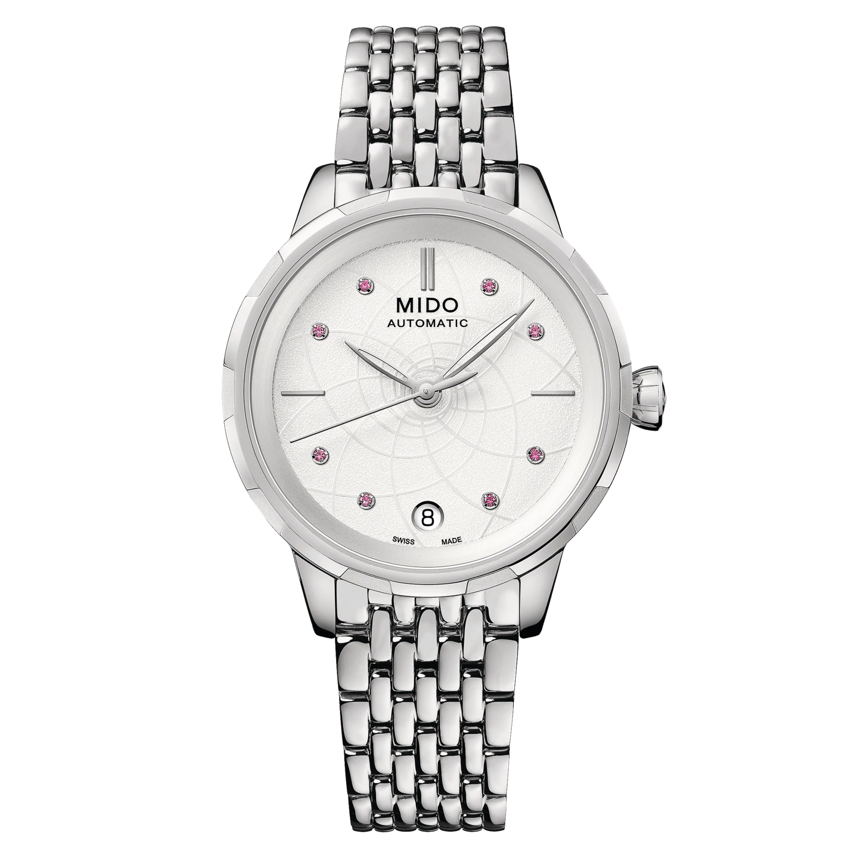 Mido Rainflower . Die Uhr hat folgende Funktionen: Datum . Die Grundparameter der Uhr sind: ziffernblattfarbe ist weiß, bewegungsart ist mechanische Uhr mit automatischem Aufzug, armbandmaterial ist Leder und wasserabweisend ist 30 m.