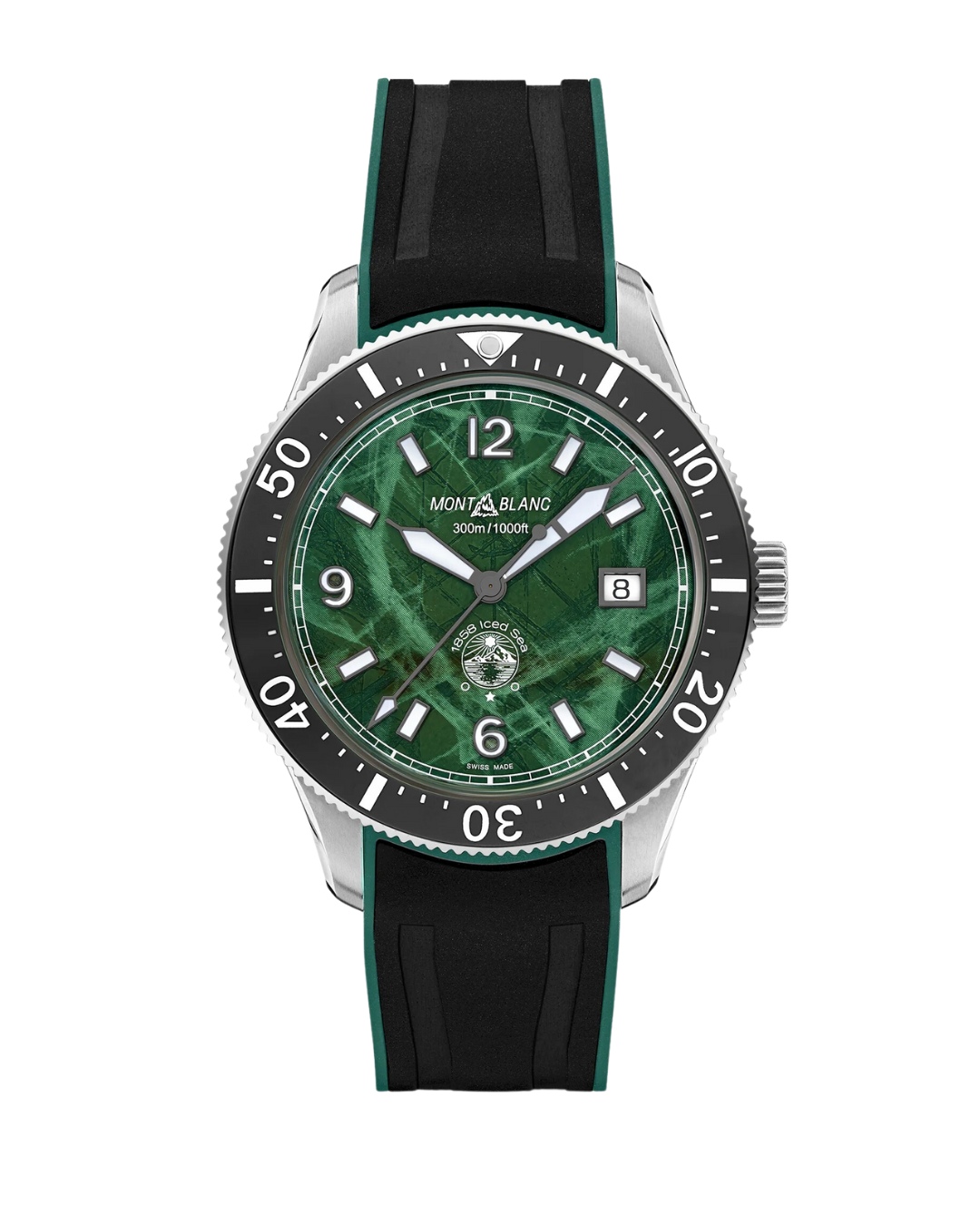 Montblanc 1858 Collection Iced Sea Automatik, 41 mm. Die Uhr hat folgende Funktionen: Lumineszenz und Datum . Die Grundparameter der Uhr sind: bewegungsart ist mechanische Uhr mit automatischem Aufzug, armbandmaterial ist Gummi, wasserabweisend ist 300 m und ziffernblattfarbe ist grün.