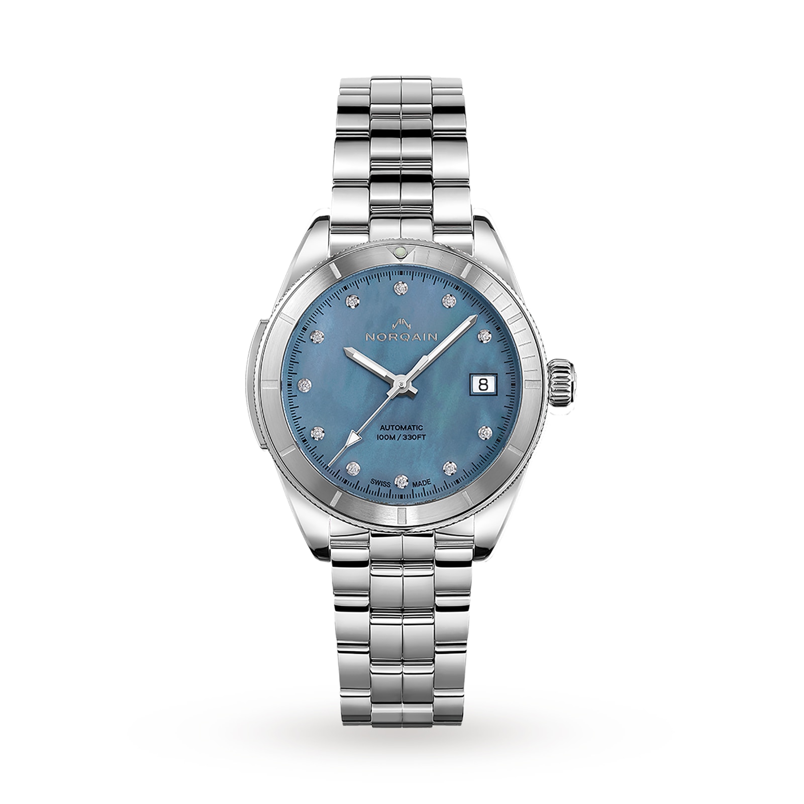 Norquain ADVENTURE SPORT 37MM Automatische, Diamonds. Die Uhr hat folgende Funktionen: Lumineszenz und Datum . Die Grundparameter der Uhr sind: bewegungsart ist mechanische Uhr mit automatischem Aufzug, wasserabweisend ist 100 m, ziffernblattfarbe ist blau und perlmuttern und armbandmaterial ist Stahl.