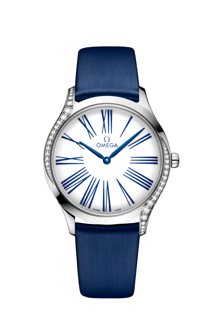 Omega De Ville Trésor . Die Grundparameter der Uhr sind: bewegungsart ist Quarzuhren, wasserabweisend ist 30 m, ziffernblattfarbe ist weiß und armbandmaterial ist Textilien.