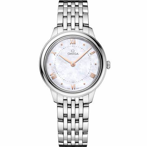 Omega De Ville Prestige Diamante, Quartz, 27.4 mm. Die Grundparameter der Uhr sind: wasserabweisend ist 30 m, bewegungsart ist Quarzuhren, armbandmaterial ist Stahl und ziffernblattfarbe ist perlmuttern.