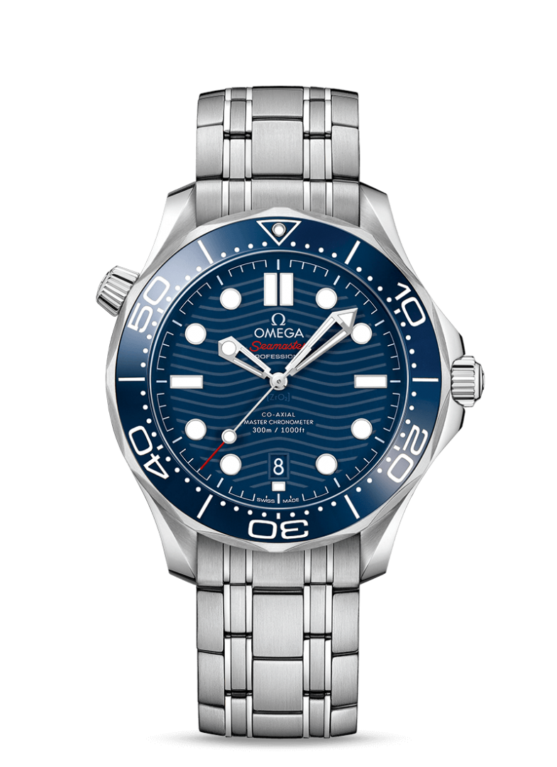 Omega Seamaster Diver 300M . Die Uhr hat folgende Funktionen: Helium-Ablassventil, Lumineszenz und Datum . Die Grundparameter der Uhr sind: bewegungsart ist mechanische Uhr mit automatischem Aufzug, wasserabweisend ist 300 m, ziffernblattfarbe ist blau und armbandmaterial ist Stahl.