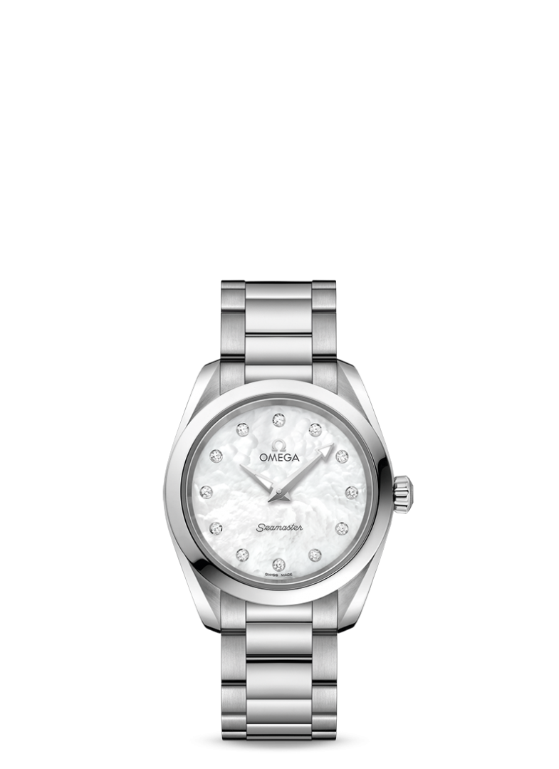 Omega Seamaster Aqua Terra 150M . Die Uhr hat folgende Funktionen: Lumineszenz und Datum . Die Grundparameter der Uhr sind: ziffernblattfarbe ist perlmuttern, bewegungsart ist Quarzuhren, armbandmaterial ist Stahl und wasserabweisend ist 150 m.